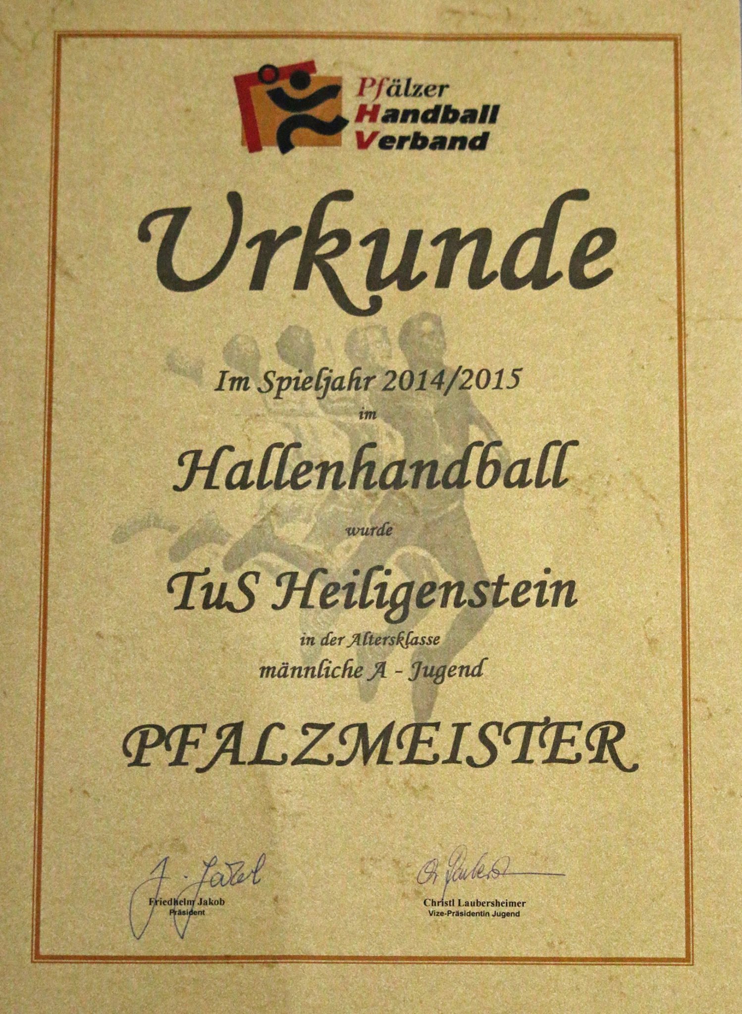 26. April 2015Auch das letzte Heimspiel der A-Jugend des TUS Heiligenstein wurde sicher gewonnen und somit mit 40:0 Punkten souverän der Titel des A-Jugend-Pfalzligameisters ohne einen einzigen Spielverlust eingeholt.