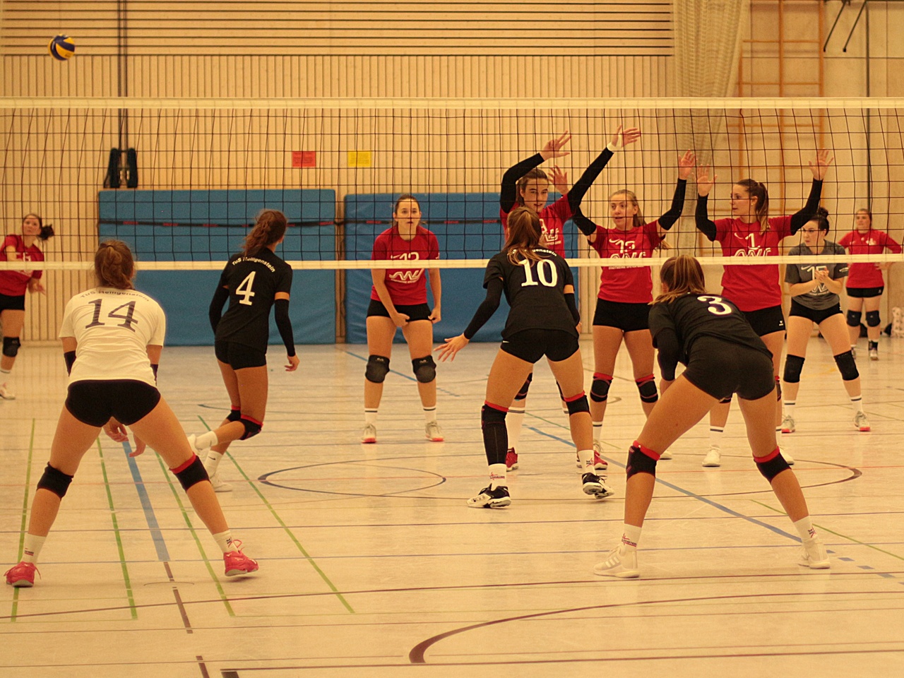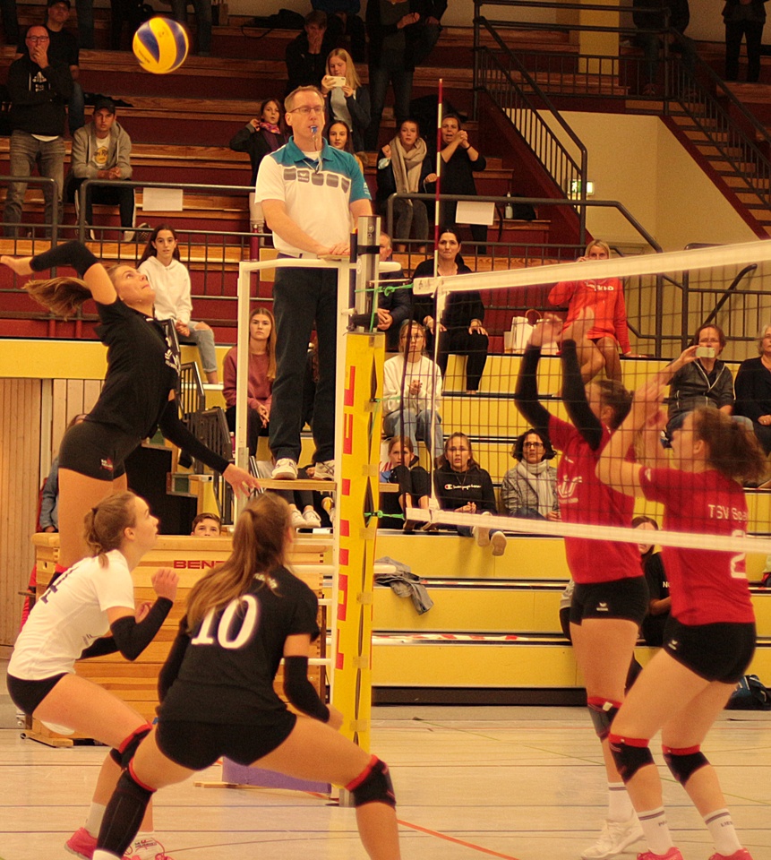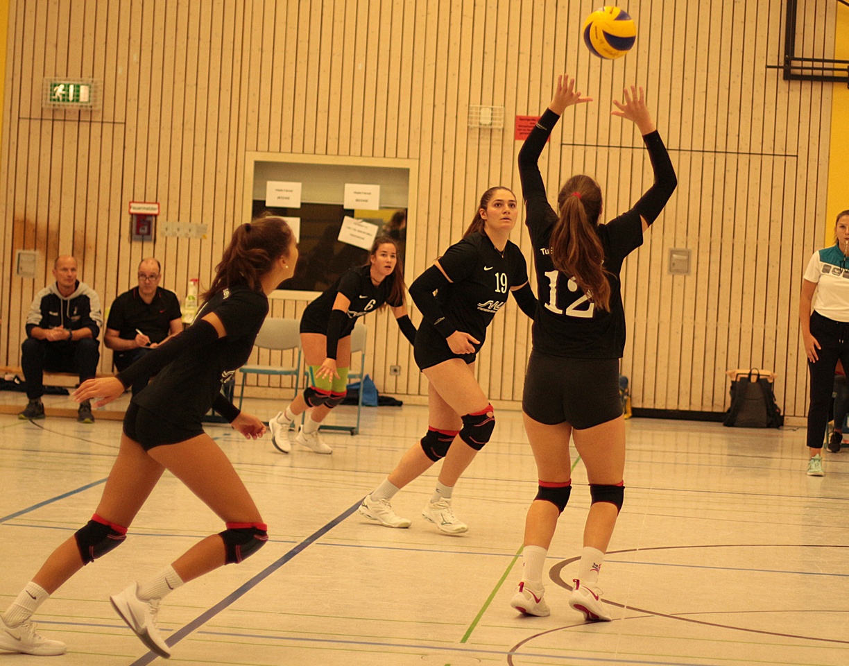 Der Seitenwechsel, begleitet von rhythmischen Trommelschlägen, tat dem TuS gut. Lange Ballwechsel und ein erfolgreicher 3-fach-Block brachten die kurzzeitige Führung. Nach einer technikbedingten Unterbrechung mussten die Mädels einem Rückstand hinterherlaufen. Die Aufschläge von Martha Walter und Emelita Semsovic halfen dabei, dass Luise Palenczat schließlich zum 11:11 ausgleichen konnte. Immer wieder gute Aktionen auf beiden Seiten zum 13:13, dann 15:15. Die Spannung in der Halle war deutlich zu spüren. Miriam Metzger hatte erneut Aufschlag, was die TSV-Annahme ordentlich beschäftigte und den TuS mit 19:15 nach vorne brachte.