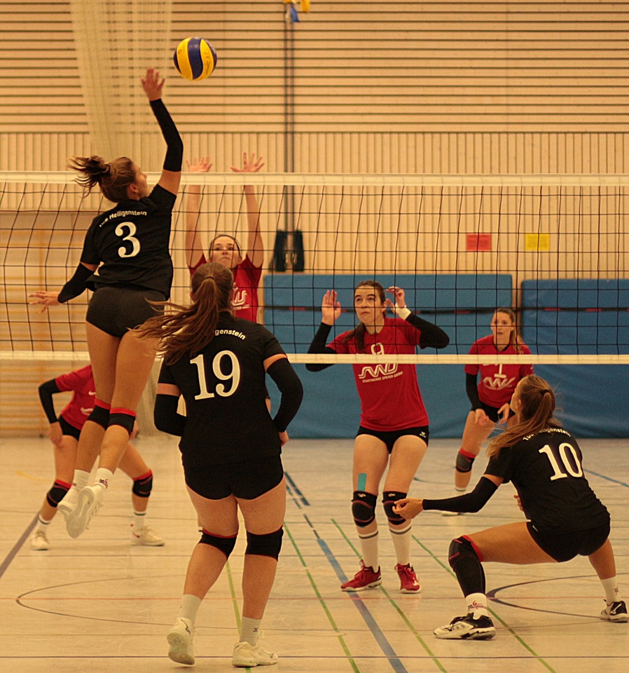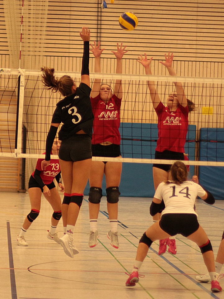 Der TuS hatte den ersten Aufschlag, und der landete gleich im Netz. Doch das sollte keineswegs als schlechtes Ohmen verstanden werden. Denn auch der TSV Speyer brauchte etwas Zeit, um den Oberliga Newcomer aus Heiligenstein in seiner neuen Rolle wieder einzuschätzen. Vom 3:3 bis 7:7 kamen die TuS–Aufschläge noch etwas zu lang, und der Block musste sich auch gleich geschlagen geben. Trotzdem spielten beide Mannschaften auf Augenhöhe, bis der TSV den Druck steigern konnte. Besonders am Netz zeigten sich die Spielerinnen aus Speyer sehr routiniert und erhöhten bald auf 16:10. Erneut landeten viele gute TuS-Angriffe im Aus. Nach einem sehenswerten langen Ballwechsel, den der TSV konsequent zum 20:12 abschloss, musste Trainer Udo Walter eine weitere Auszeit nehmen. Die Verschnaufpause zeigte aber leider nicht die erhoffte Wirkung.