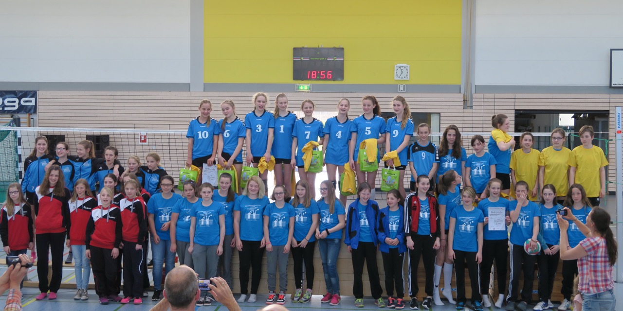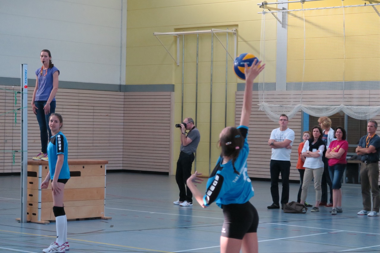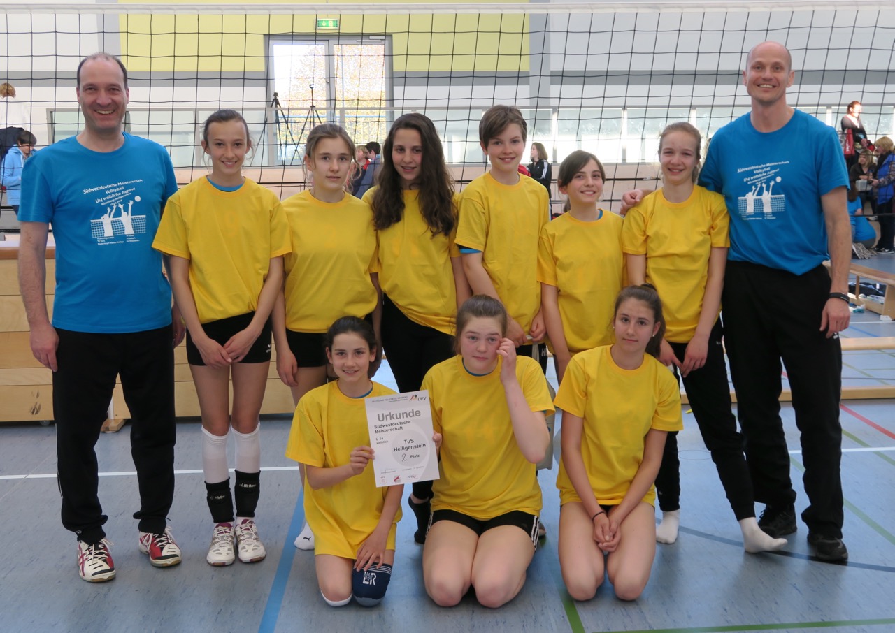 19. April 2015Bei der Südwestdeutschen Meisterschaft in eigener Halle hat die Volleyball-U14 des TuS Heiligenstein den 2. Platz erreicht und hat sich somit zur Deutschen Meisterschaft in Straubing qualifiziert. Das erste Gruppenspiel gegen den TV Lebach (Saarland 2) agierten die TuS-Mädels noch sehr gehemmt, konnten sich aber dennoch mit 2:0 Sätzen (25-13, 25-17) durchsetzen. Im zweiten Gruppenspiel gegen die Biedenkopf-Wetter-Volleys (Hessen 1) traf man auf den erwartet starken Gegner und die Sätze gingen leider knapp verloren (24-26, 21-25). Mit dem zweiten Platz in der Gruppe waren die Mädchen somit für das Halbfinale gegen den Gewinner der anderen Gruppe qualifiziert. In einem sehr umkämpften Spiel um den Gruppensieg konnte sich dort der TV Lützel (Rheinland-Pfalz 2) gegen den VC Wiesbaden (Hessen 2) durchsetzen und somit standen die beiden Halbfnals fest: TV Lützel gg. TuS Heiligenstein und Biedenkopf-Wetter-Volleys gg. VC Wiesbaden.