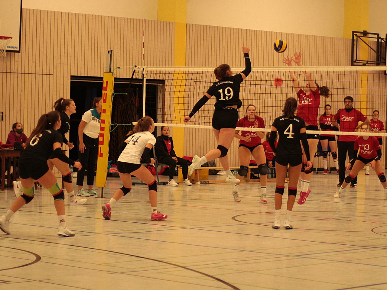 Der 4. Satz hielt den Spannungslevel hoch und die Heiligensteiner Fans schon fast nicht mehr auf den Plätzen. Der TSV Speyer kam wieder gut ins Spiel, schlug weiterhin stark auf. Der TuS-Block stand gut beim Ausgleich zum 6:6, aber die eigenen Aufschläge gingen danach wieder öfter ins Aus. Speyer agierte in dieser wichtigen Spielphase souverän, übernahm nach schönen Ballwechseln auf beiden Seiten die erneute Führung mit 12:8.