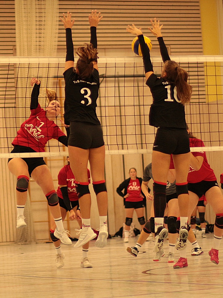 Der Seitenwechsel, begleitet von rhythmischen Trommelschlägen, tat dem TuS gut. Lange Ballwechsel und ein erfolgreicher 3-fach-Block brachten die kurzzeitige Führung. Nach einer technikbedingten Unterbrechung mussten die Mädels einem Rückstand hinterherlaufen. Die Aufschläge von Martha Walter und Emelita Semsovic halfen dabei, dass Luise Palenczat schließlich zum 11:11 ausgleichen konnte. Immer wieder gute Aktionen auf beiden Seiten zum 13:13, dann 15:15. Die Spannung in der Halle war deutlich zu spüren. Miriam Metzger hatte erneut Aufschlag, was die TSV-Annahme ordentlich beschäftigte und den TuS mit 19:15 nach vorne brachte.