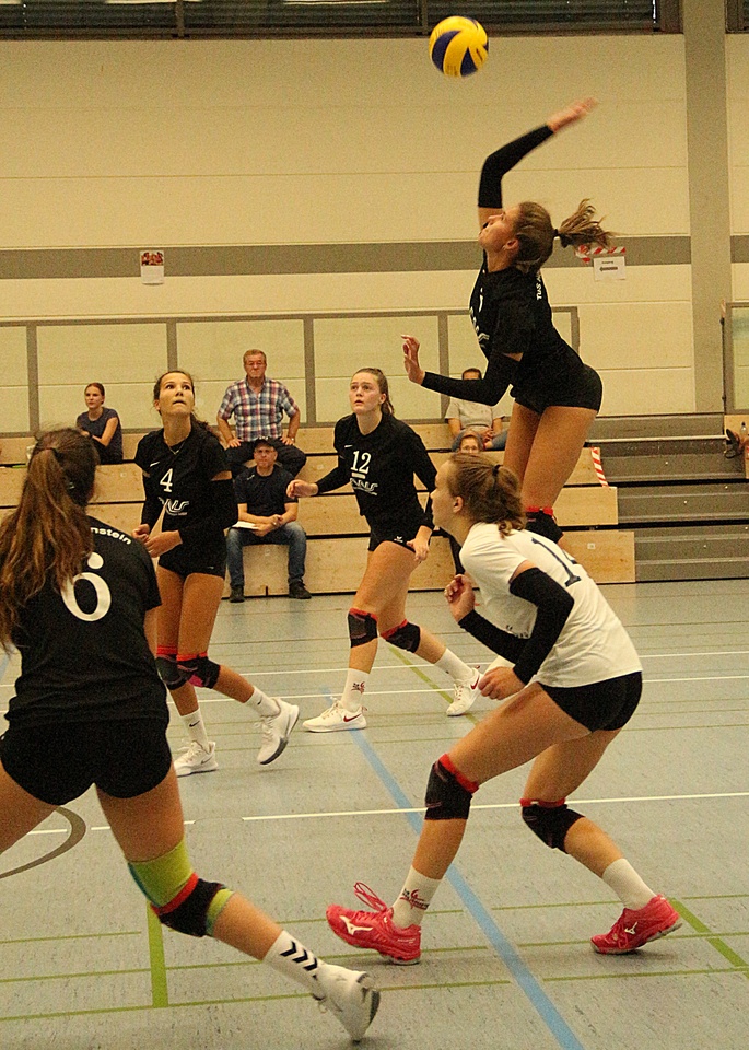 Gleich zu Spielbeginn gaben die Gäste mit präzisen Aufschlägen den Ton an und entschieden die ersten Punkte für sich. Dennoch konnten die TuS-Damen dran bleiben und durch Jasmin Rudolph nach gutem Block und einem klasse Aufschlag zum 6:6 ausgleichen. Ein vielversprechender Start.
